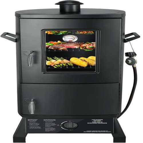 El ahumador vertical conocido también como barril ahumador es el que más me convenció, al final por su eficiencia, este tipo de ahumador es un equipo cilíndrico compacto de acero inoxidable por lo general que cocina mediante convección, el fuego se sitúa en la base, mientras que la carne se coloca en parrillas superiores o se cuelga con ganchos.